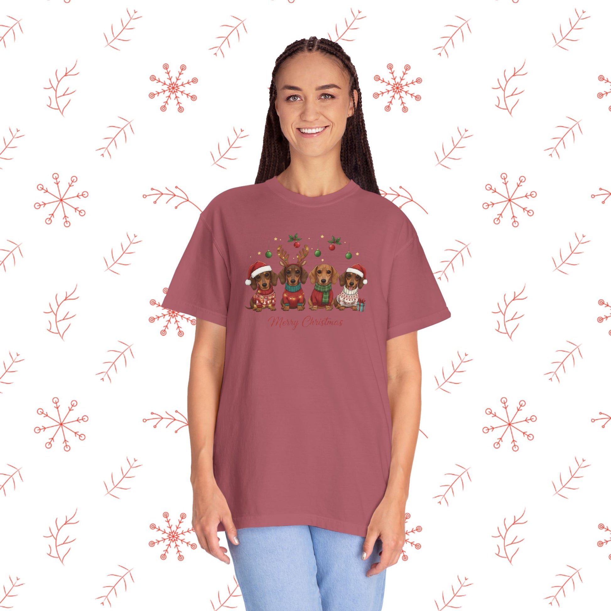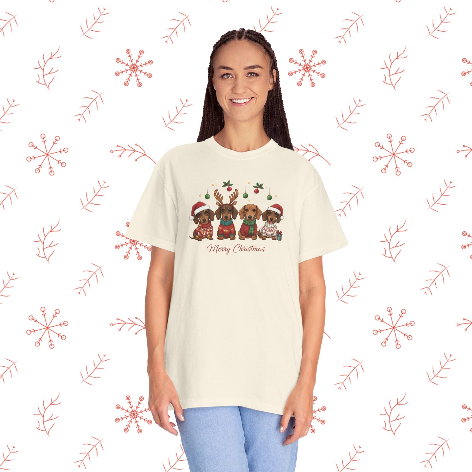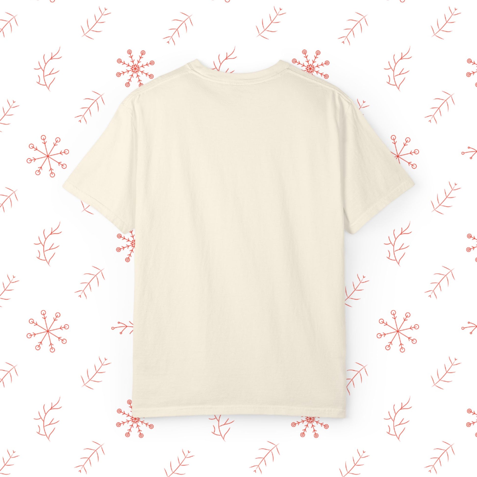 Soft, lived-in, and quietly festive — this garment-dyed tee brings a gentle holiday smile without shouting for attention. The relaxed cut and medium-weight 100% ring-spun cotton feels broken-in from the first wear, and the muted, post-dye hues make the illustrated pups and tiny seasonal details look like a cozy memory rather than a loud graphic. Wear it while wrapping presents, wandering neighborhood streets to see lights, or sipping cocoa by the window. The tubular knit and double-needle seams mean it holds its shape through many winters, and the sewn-in label keeps the neckline comfortable. It pairs naturally with worn jeans, an oversized cardigan, or layered under a flannel for chilly mornings.