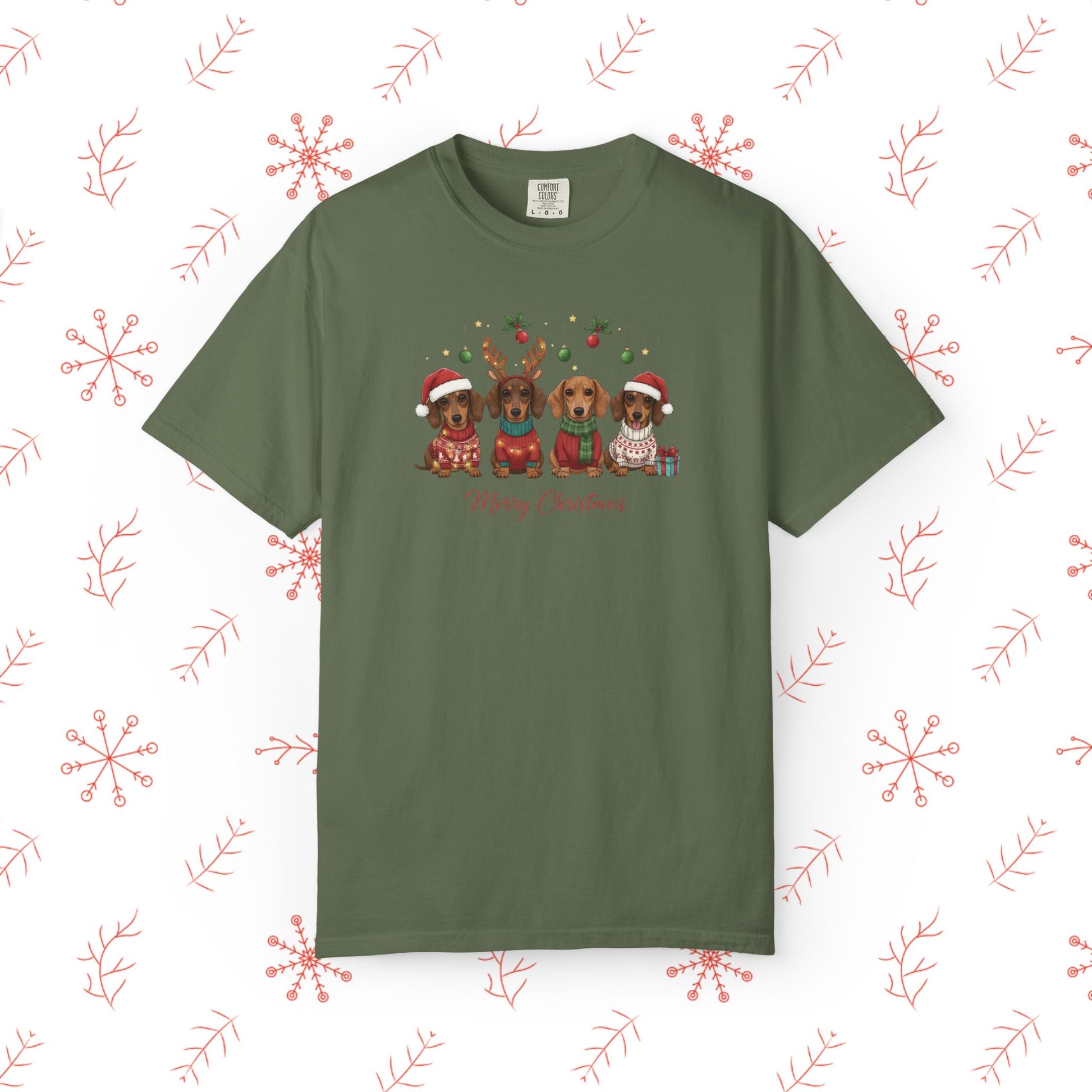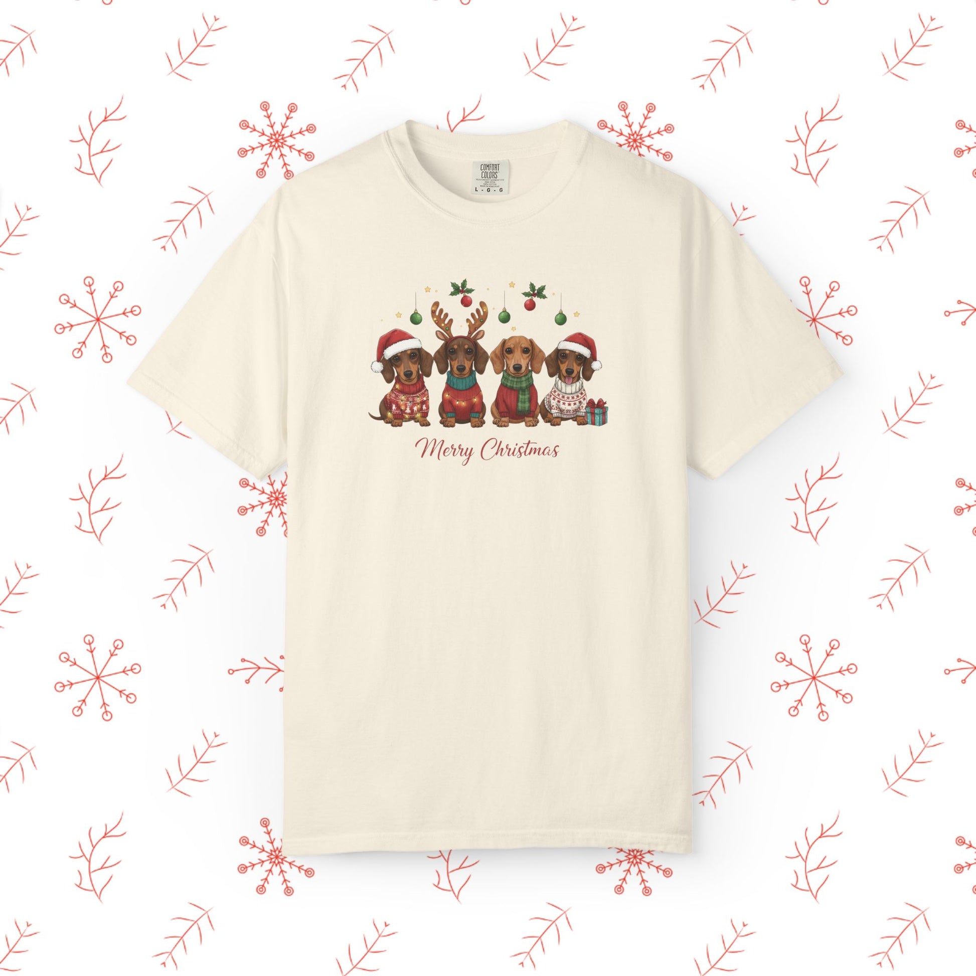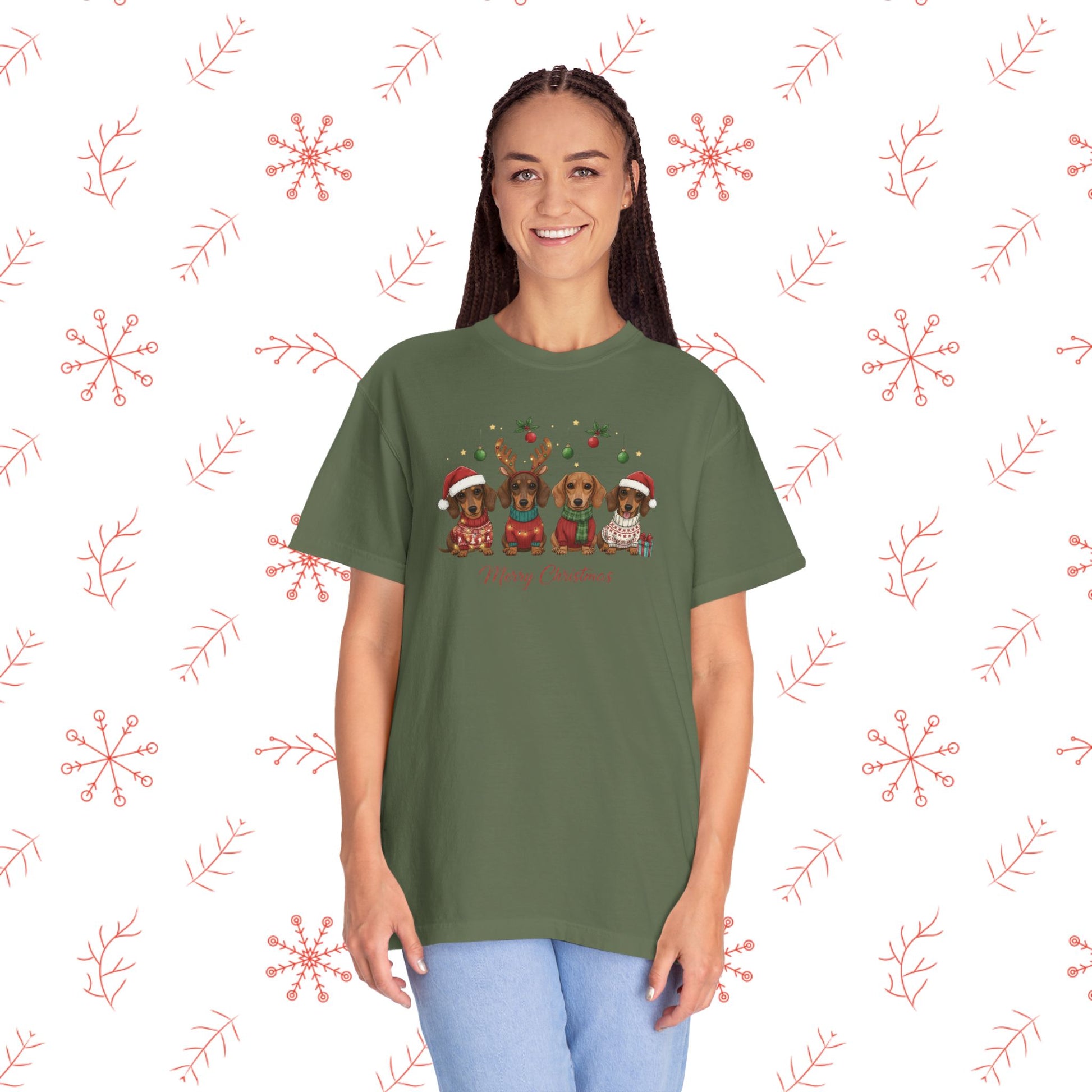 Soft, lived-in, and quietly festive — this garment-dyed tee brings a gentle holiday smile without shouting for attention. The relaxed cut and medium-weight 100% ring-spun cotton feels broken-in from the first wear, and the muted, post-dye hues make the illustrated pups and tiny seasonal details look like a cozy memory rather than a loud graphic. Wear it while wrapping presents, wandering neighborhood streets to see lights, or sipping cocoa by the window. The tubular knit and double-needle seams mean it holds its shape through many winters, and the sewn-in label keeps the neckline comfortable. It pairs naturally with worn jeans, an oversized cardigan, or layered under a flannel for chilly mornings.