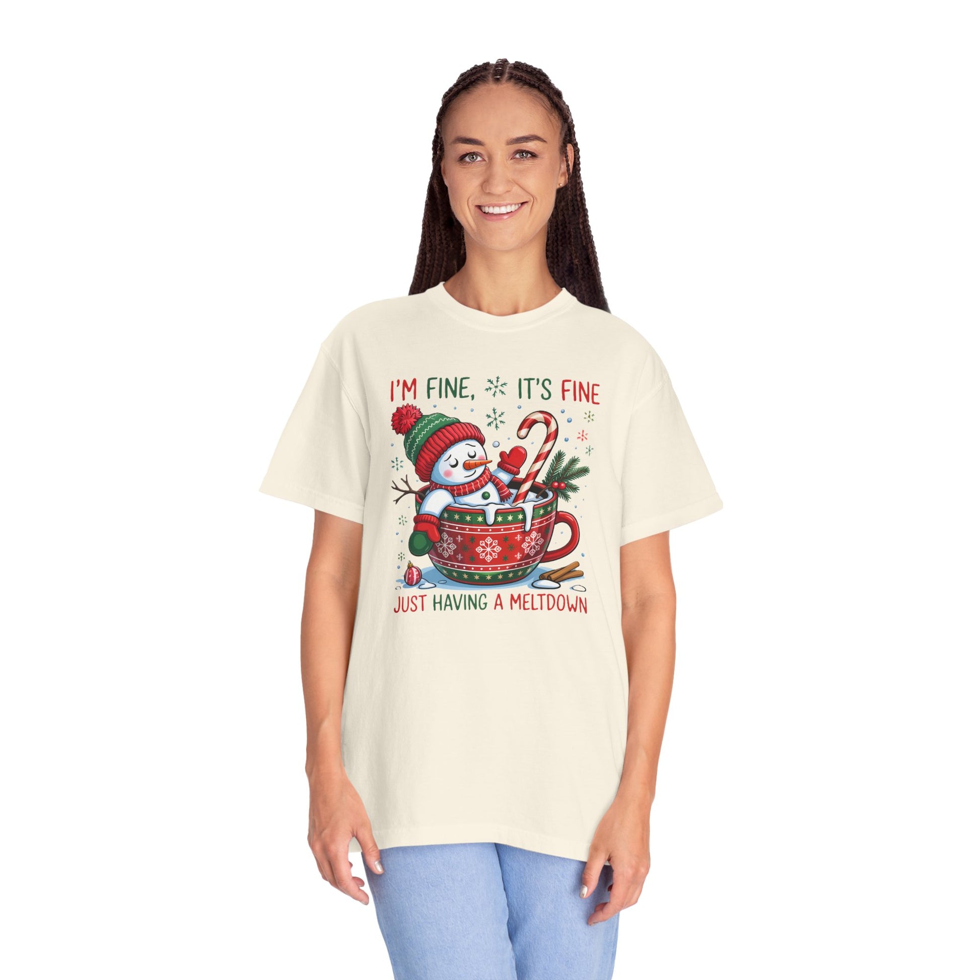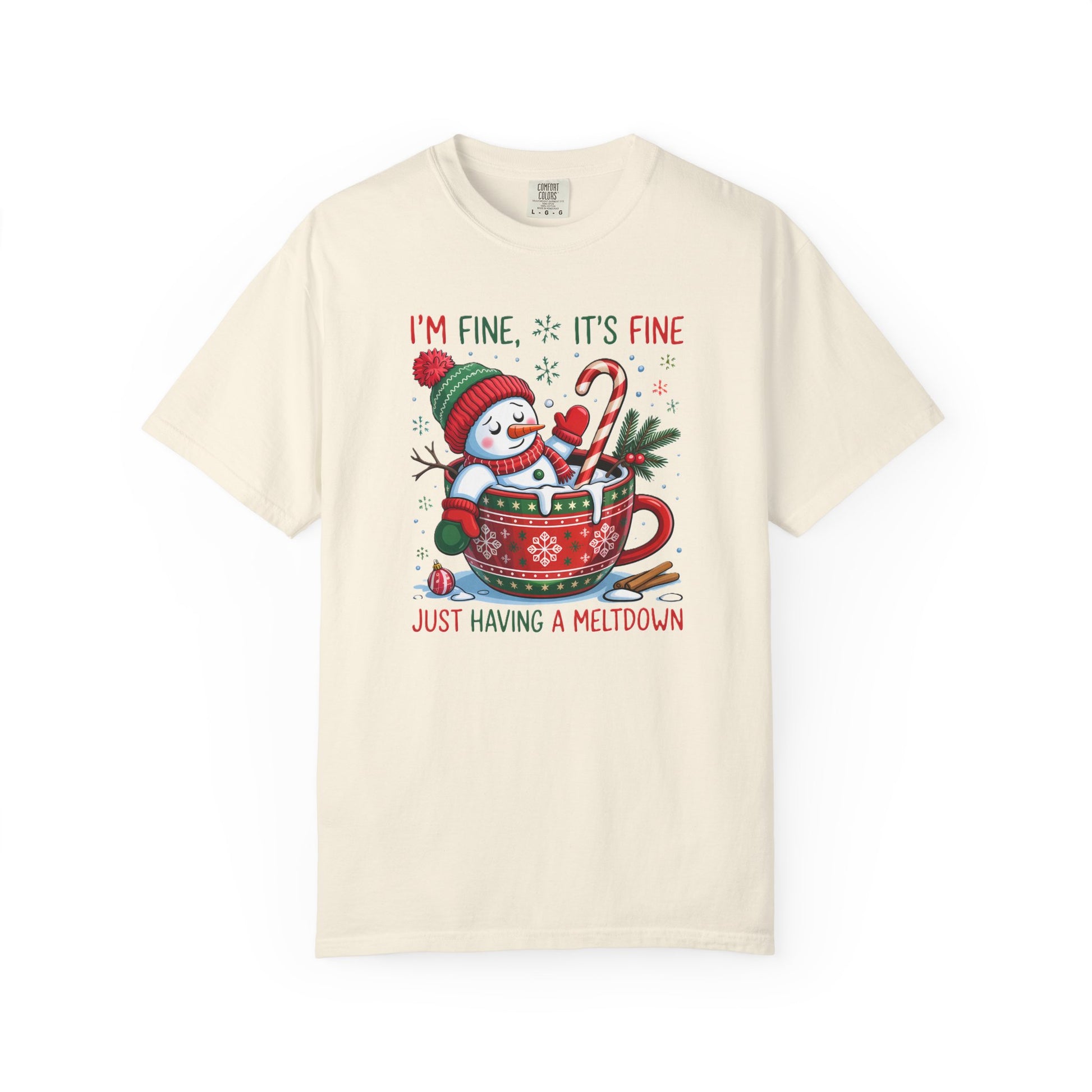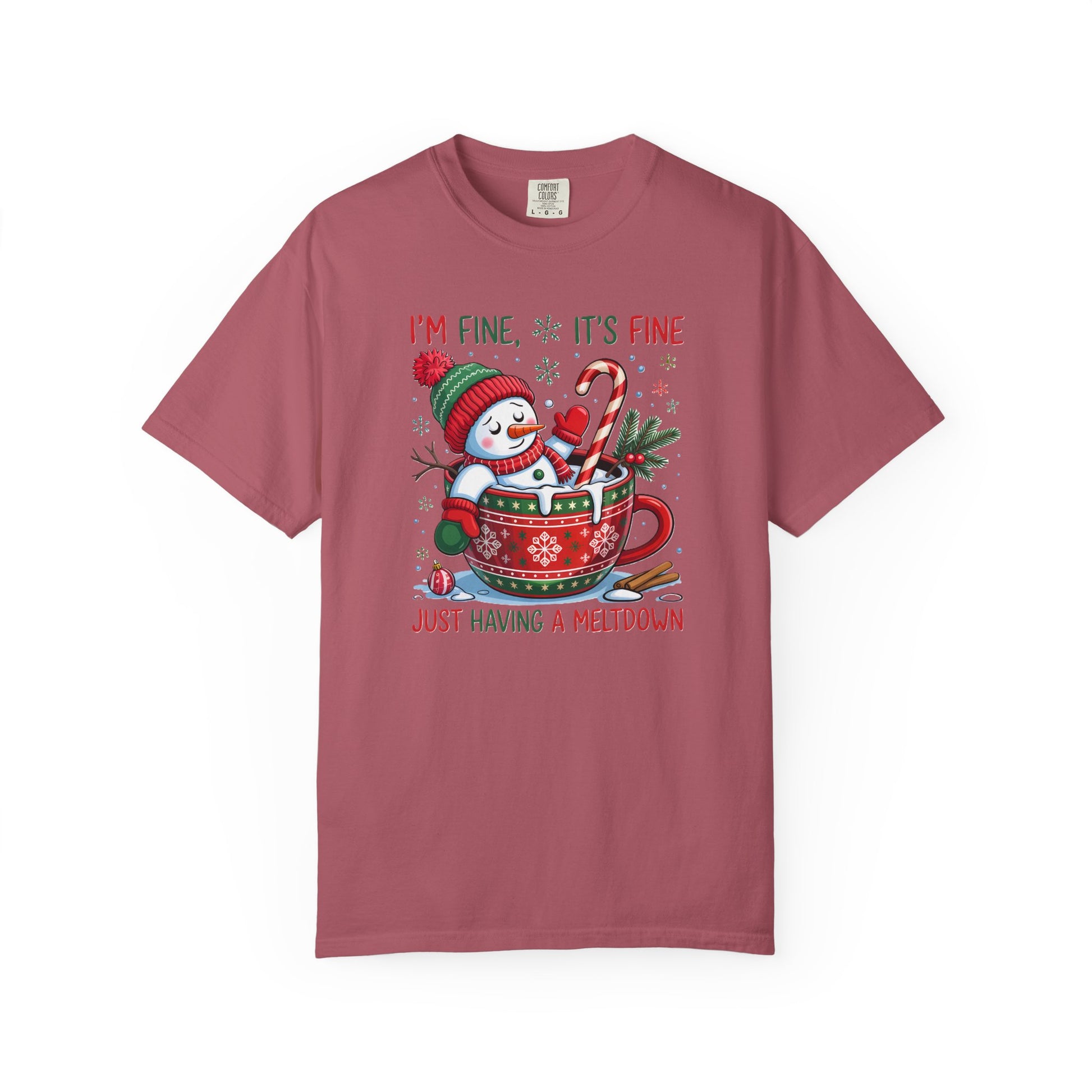 A relaxed, garment-dyed tee that wears like a favorite from day one. Soft 100% ring-spun cotton and medium-weight fabric give this shirt a cozy, lived-in feel — perfect for quiet afternoons watching snow fall or chaotic holiday prep. The playful illustration of a melting snowman in a festive mug reads “I’m fine, it’s fine — just having a meltdown,” bringing wry holiday humor to casual outfits. With sturdy double-needle stitching and tubular knit construction, this tee holds its shape wash after wash while keeping seams smooth and comfortable. Available in many colors and sizes, it’s an easy layer for laid-back winter gatherings, cookie-baking marathons, or low-key gift exchanges.