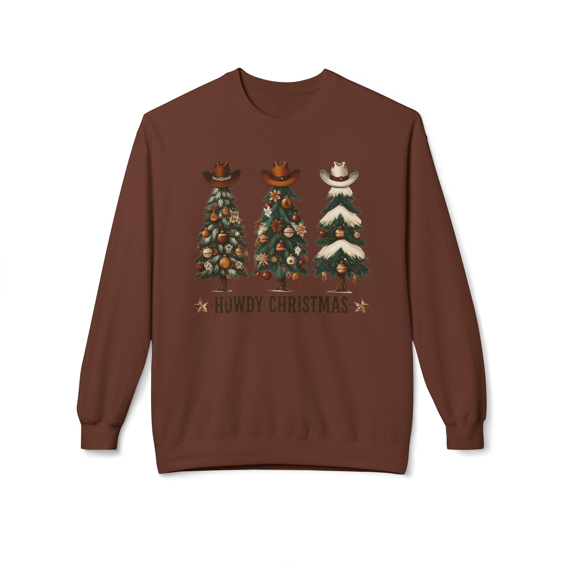 Wear a little frontier cheer this season. This midweight crewneck pairs cozy heft with playful western charm: three evergreen trees trimmed in vintage ornaments and topped with cowboy hats, stamped beneath with “Howdy Christmas.” It drapes relaxed across dropped shoulders and holds its shape thanks to ribbed cuffs and hem with spandex. The tubular knit body gives a clean, seam-free silhouette, while the soft ring‑spun cotton blend and medium-heavy weight keep you warm through chilly mornings, caroling stops, or fireside cocoa. Tear‑away label and REACH compliance make it comfortable and responsibly made — a familiar, lived-in sweatshirt that reads like a nod and a wink to farmhouse porches, holiday barn dances, and cozy nights with kin.