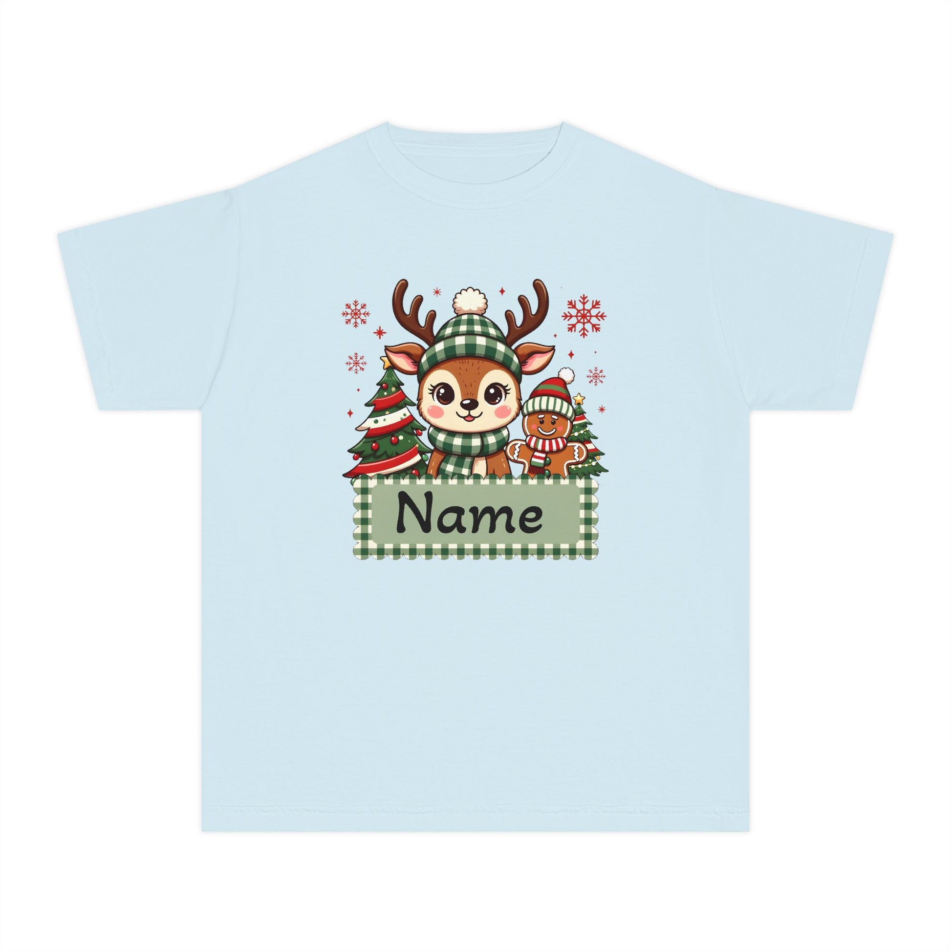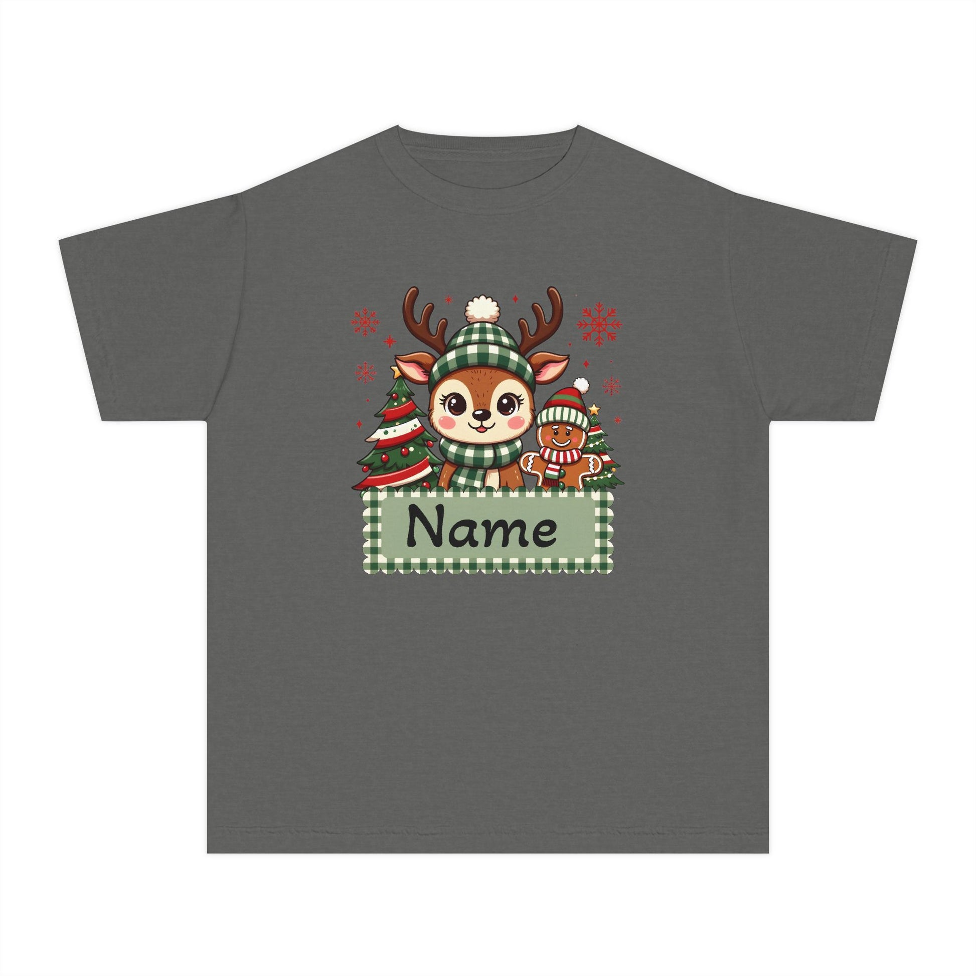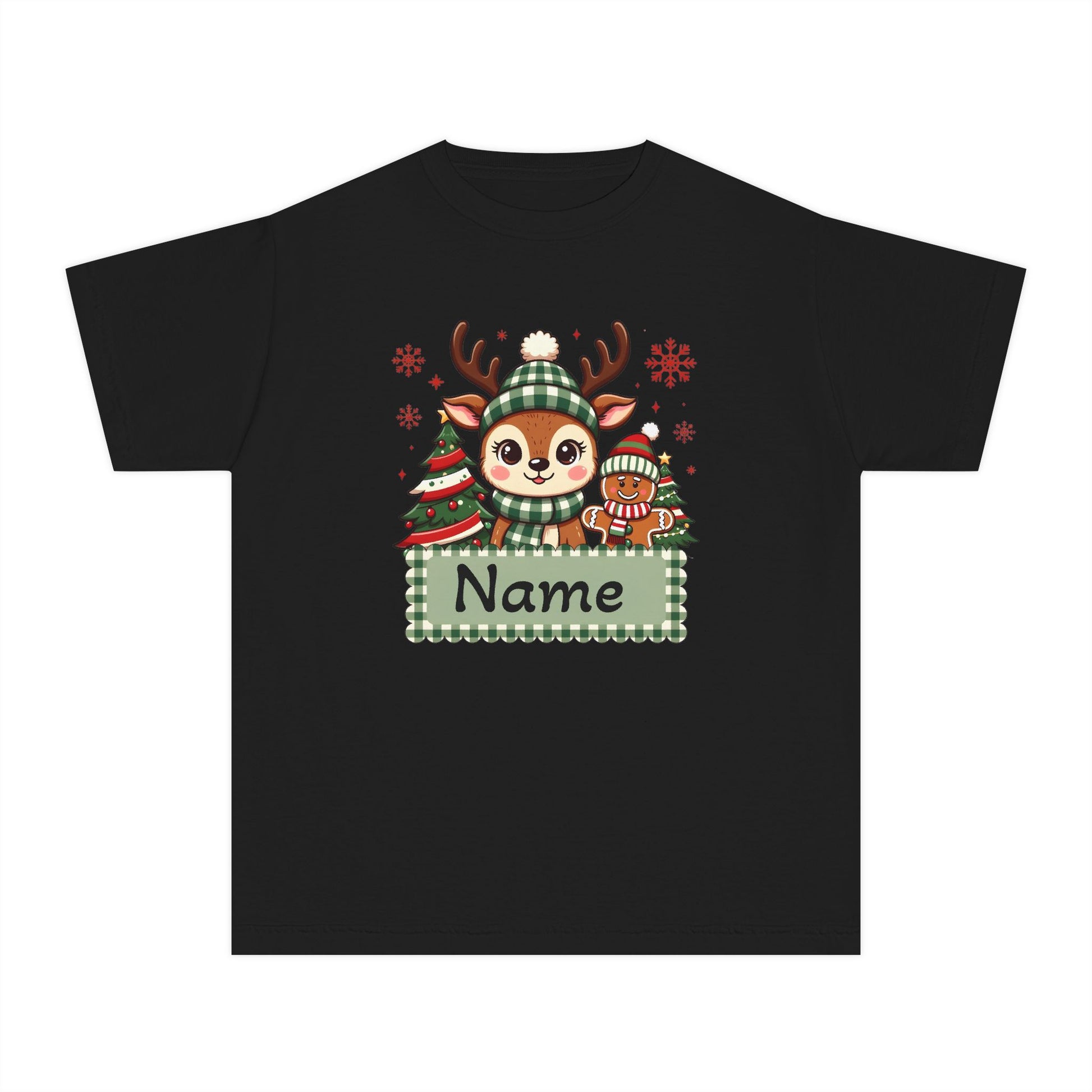 Soft, cozy midweight tee with a playful winter woodland scene—an adorable reindeer in a knit hat, a striped penguin friend, and a decorated evergreen framed by a green gingham nameplate. The garment-dyed cotton feels gently worn from the first wear, and the classic fit lets kids move freely while looking seasonal and sweet. This tee brings a quiet, homey holiday energy to school programs, family photos, and cozy mornings by the tree. The muted yellow base and hand-drawn illustration create a charming, storybook vibe that layers beautifully under jackets or pairs with favorite joggers for comfortable holiday outings.